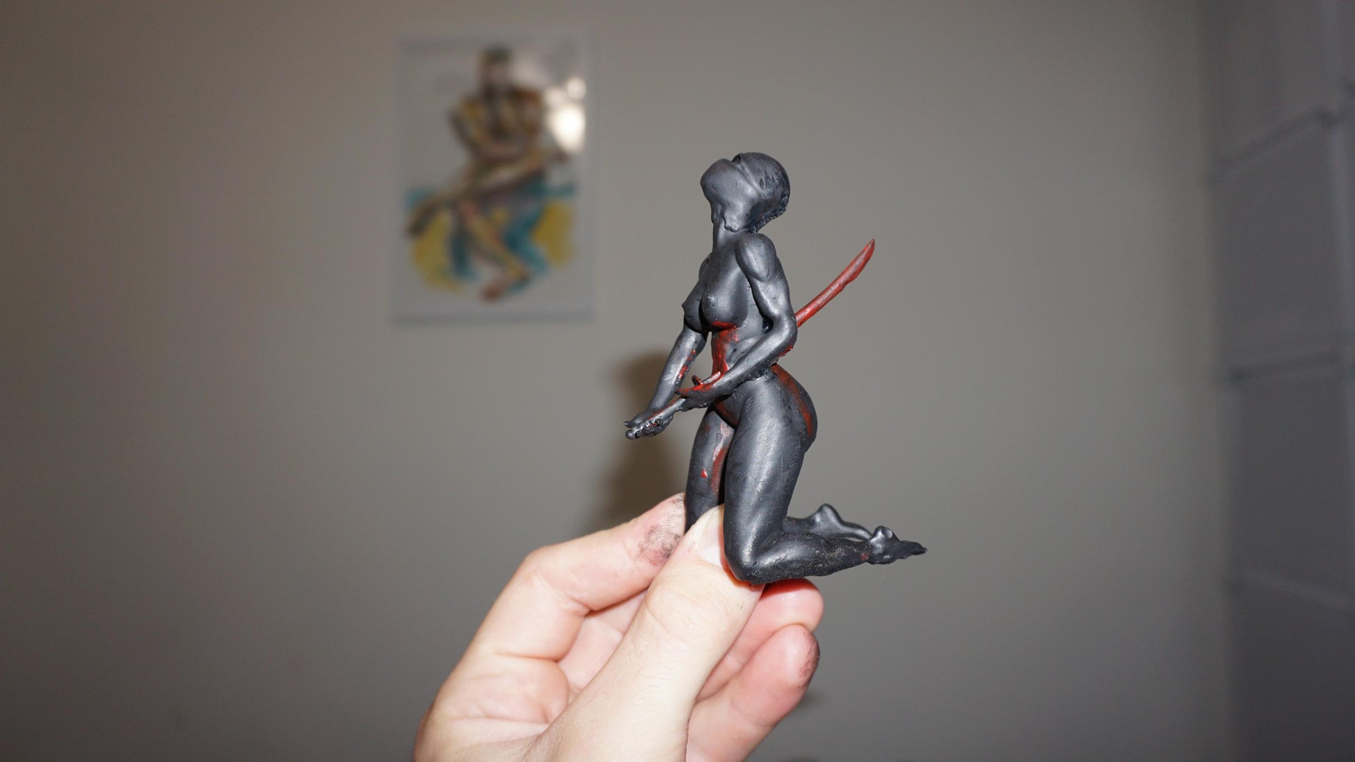 Statue of a ninja caught in his final act — kneeling with the blade across her stomach - ritual. Sculpted with dramatic folds in her mask and a solemn pose, it captures the heavy moment of sacrifice and warrior code.