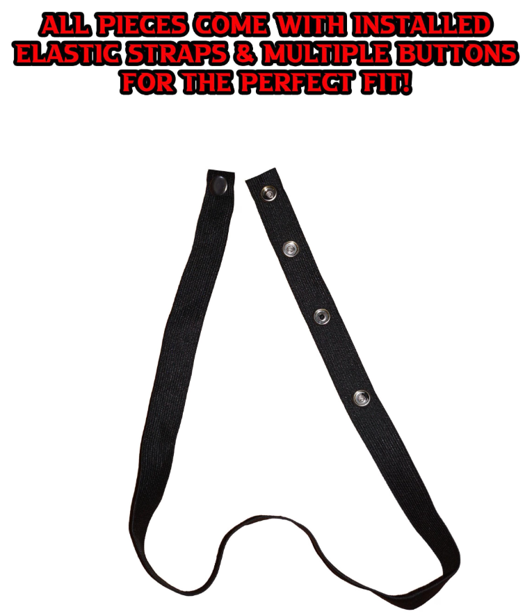 Each piece comes with adjustable buttoned elastic straps. Fits everyone!